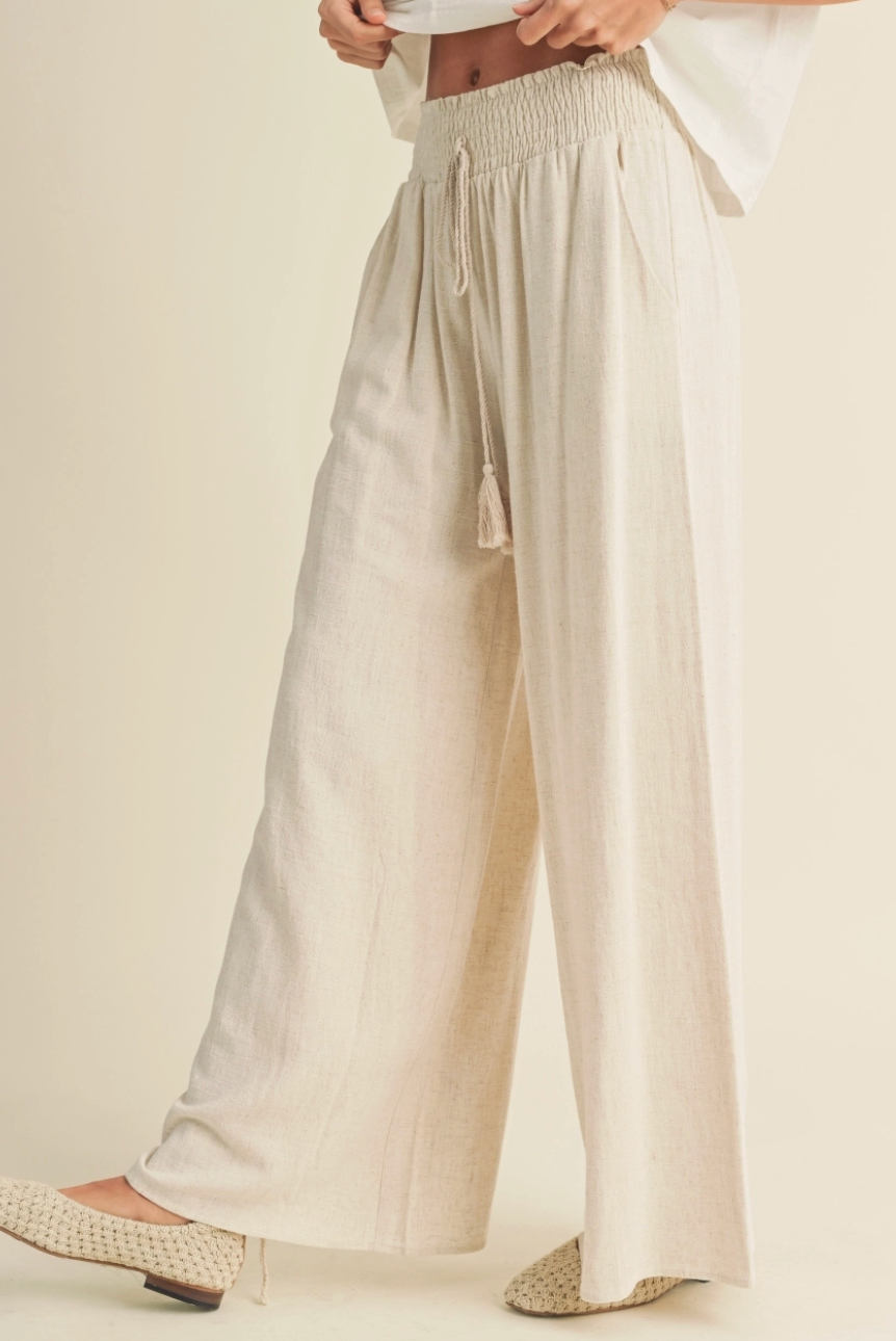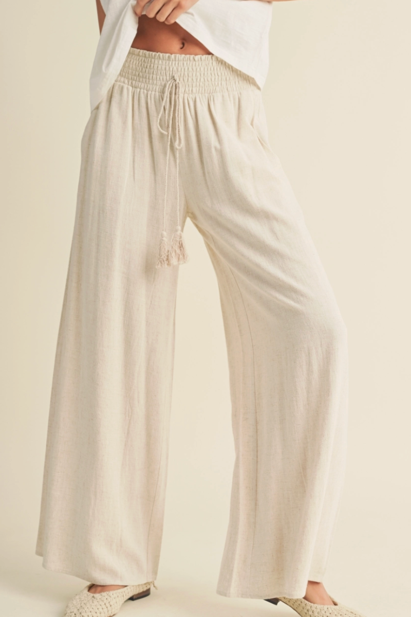 Effortless comfort meets laid-back style with these Julie linen blend pants. The relaxed wide-leg silhouette drapes beautifully while the smocked stretchy waist moves with you—no pinching, no fussing. Practical pockets keep your essentials close, and the breathable linen blend keeps you cool and collected all day long. Perfect for everything from weekend adventures to casual office vibes.