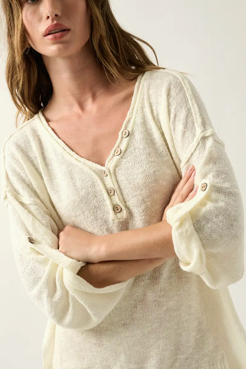 The Lisa Lightweight Knit Henley is your go-to layering piece for effortless style. Crafted from super soft yarn, this henley drapes beautifully without the bulk. Roll-up sleeves let you adjust the fit to your mood—wear them down for a polished look or cuffed for a relaxed vibe. Perfect for spring transitions, casual weekends, or layering under jackets. Lightweight enough to pack, comfortable enough to live in.